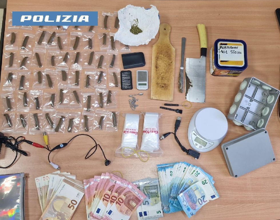 Il blitz è scattato in un’abitazione di vico Paradiso, dove l’uomo si trovava ai domiciliari con braccialetto elettronico. All’interno, ben occultati, i poliziotti hanno trovato 55 involucri di hashish (circa 150 grammi), una dose di marijuana, materiale per il confezionamento e 1.885 euro in contanti, ritenuti provento dell’attività illecita.
