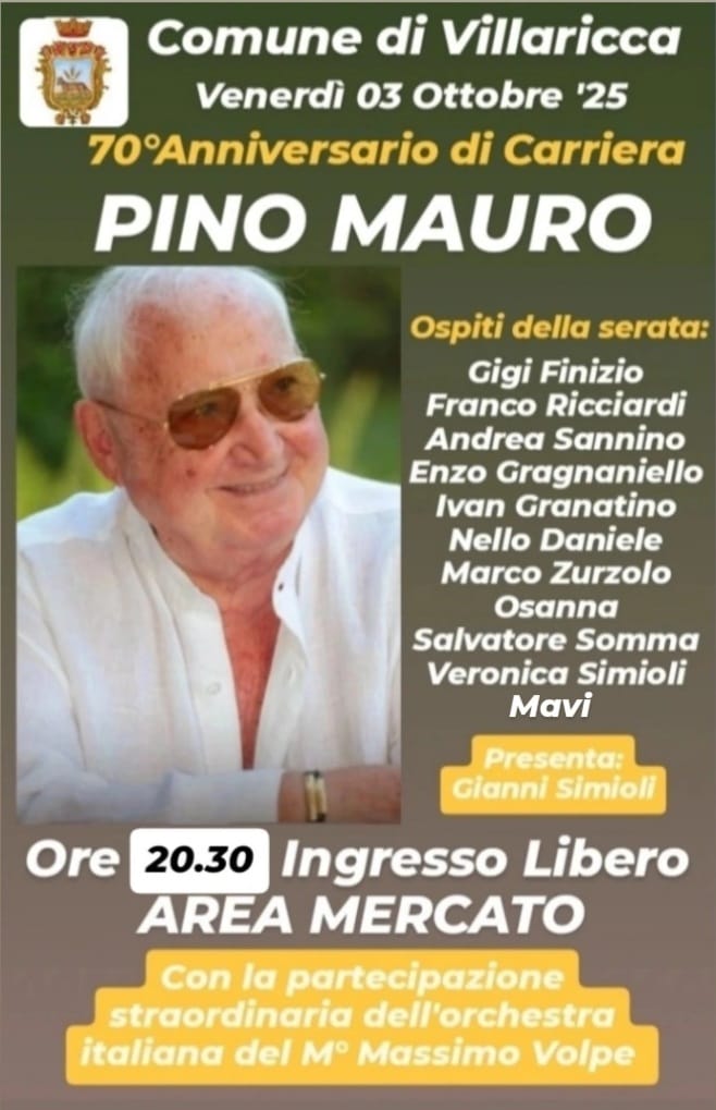 Una serata speciale per un traguardo straordinario: venerdì 3 ottobre 2025, a partire dalle ore 20.30, l’Area Mercato di Villaricca ospiterà uno show unico per celebrare i 70 anni di carriera del Maestro Pino Mauro, l’ultimo dei grandi della tradizione partenopea, considerato il re della sceneggiata e ambasciatore della melodia napoletana nel mondo.