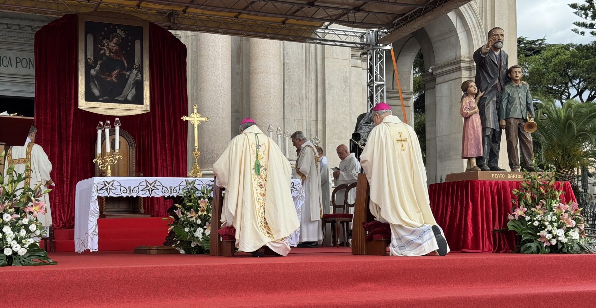 Dinanzi alla facciata del Santuario, intitolata alla pace universale, il Vescovo ha invitato i fedeli a pregare: «Pietà e pace oggi imploriamo per le Nazioni traviate, per tutta l’Europa, per tutto il mondo. Misericordia per tutti, o Madre di Misericordia!».
