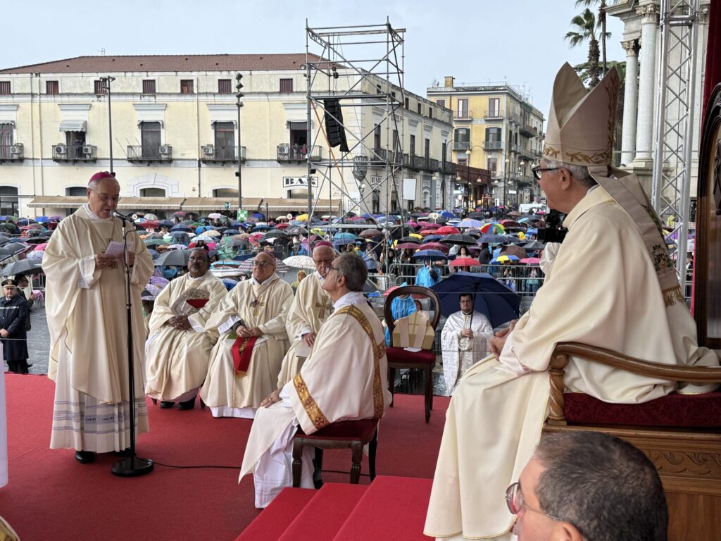 Nell’accogliere Monsignor Pisanello, l’Arcivescovo Caputo ha ricordato il profondo legame tra Pompei e la Puglia: «Lei è il “vescovo di Bartolo Longo” perché Latiano, la città che nel 1841 diede i natali al Fondatore, è nel cuore della sua diocesi. È lì che Bartolo fu educato alla fede, imparando per la prima volta a dire “Ave Maria”».