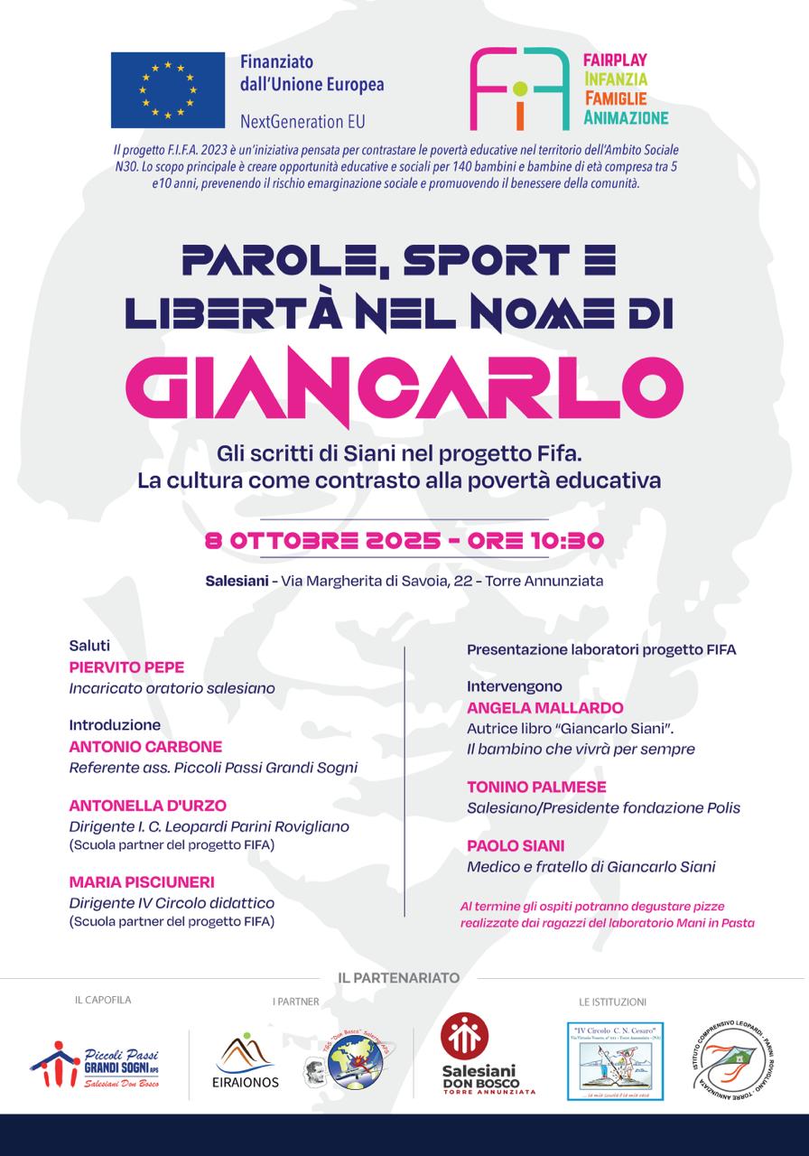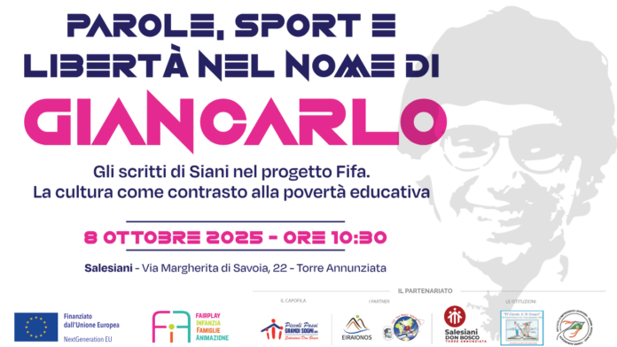 Il ricordo di Giancarlo Siani passa attraverso lo sport, il turismo e, soprattutto, la comunicazione con gli strumenti di oggi come il podcast. Si terrà nella mattinata dell’8 ottobre nella casa salesiana oplontina di Torre Annunziata, a partire dalle 10,30, l’iniziativa “Parole, sport e libertà nel nome di Giancarlo. Gli scritti di Siani nel progetto Fifa. La cultura come contrasto alla povertà educativa”.