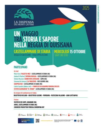 Saranno presenti anche gli artigiani del gusto di Castellammare, tra cui Biscottificio Riccardi, Biscottificio Cascone, Pomodama, Pasticceria Palladino e Gran Caffè Napoli. Partner d’eccellenza: Pastificio dei Campi, Adhoc Castellammare, Consorzio Produttori Penisola Sorrentina Dop e altri attori del territorio.