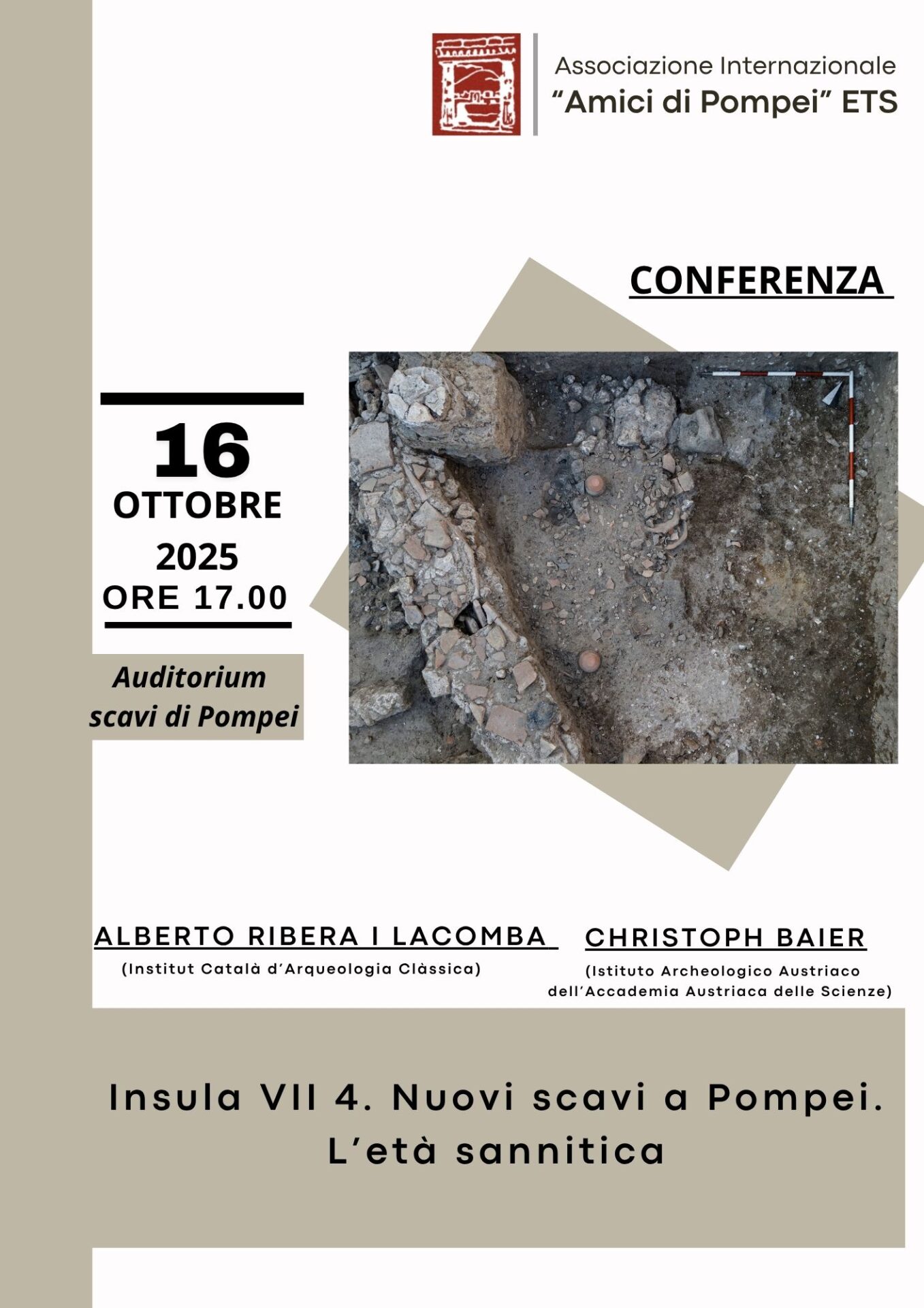 L’Associazione Internazionale Amici di Pompei ETS organizza per giovedì 16 ottobre 2025, alle ore 17, presso l’Auditorium degli Scavi di Pompei, una conferenza dal titolo “Insula VII 4. Nuovi scavi a Pompei. L’età sannitica”.