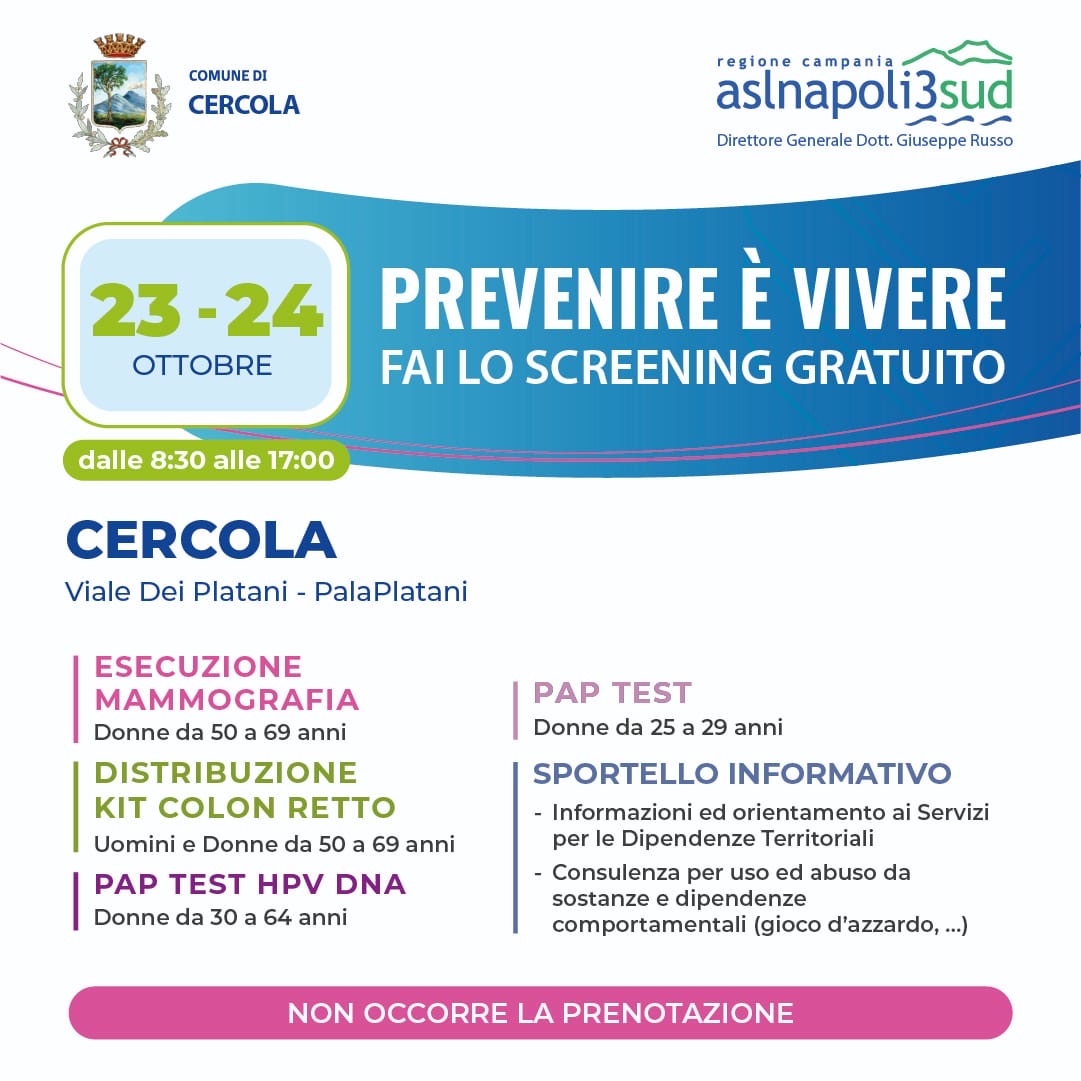 L’appuntamento si inserisce in una due giorni dedicata alla prevenzione. Domani e venerdì 24 ottobre, dalle 8.30 alle 17, in Viale dei Platani, si terrà l’iniziativa “Prevenire è vivere – fai lo screening gratuito”, promossa dal Comune e dalla Asl Napoli 3 Sud.