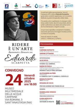 Ai saluti di Carmine Esposito, Sindaco del Comune di Sant’Anastasia, e di Simone Ottaiano, direttore del Museo Multimediale delle Acque Campane, seguiranno gli interventi di: Aldo Bova, Presidente nazionale Forum Sociosanitario; Nadia di Paola, Professoressa di economia e Gestione delle Imprese presso l’Università degli Studi di Napoli Federico II; Alessandra Alfieri, Neurochirurga; Rodolfo Matto, Clown Gelotologo; Rosaria De Cicco, Attrice. A moderare l’evento sarà Maddalena Venuso, giornalista. Sono stati invitati ad intervenire i rappresentanti della Regione Campania. A conclusione seguirà una degustazione di tipicità campane e sarà possibile partecipare al percorso espositivo realizzato da Ilaria Moscato, Curatrice d’Arte. L’iniziativa è realizzata con il contributo della Regione Campania.