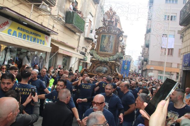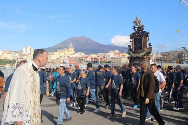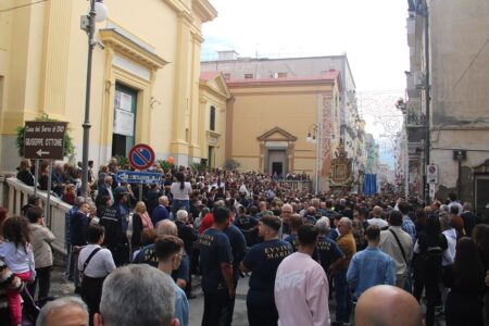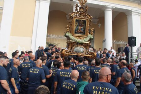 All’alba di una giornata intrisa di emozione, Torre Annunziata si è risvegliata al suono delle campane della Basilica della Madonna della Neve, pronta a vivere il momento più atteso dell’anno. Le vie cittadine si sono riempite di colori, canti e preghiere: un fiume di persone ha accompagnato il quadro della Vergine Bruna, portato a spalla dai pescatori, lungo le strade principali della città. Il passaggio della Madonna ha segnato un ritorno alle origini, un gesto collettivo che ha unito generazioni diverse sotto un’unica bandiera: quella della fede e dell’appartenenza.