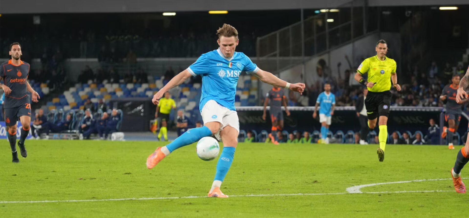 NOTE: serata serena, terreno in buone condizioni. Ammoniti: Di Lorenzo, Gilmour, Conte, Bastoni. Angoli: 4-1 per l’Inter. Recupero: 6′; 6′.