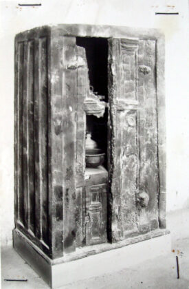Si tratta di uno straordinario armadietto/credenza in legno carbonizzato, rinvenuto con tutto il suo contenuto durante gli scavi del 1937 accanto alla Casa del Bicentenario. All’interno, come riportato nei Diari di scavo, furono trovati coppe, bicchieri, brocche e pentole, testimonianza eccezionale della vita domestica ercolanese. Subito dopo la scoperta, il mobile fu esposto in situ al piano terra della bottega sottostante l’appartamento, protetto da una teca di vetro, nell’ambito del progetto di città-museo promosso da Amedeo Maiuri che intendeva restituire ai visitatori ambienti e oggetti della quotidianità sepolti dall’eruzione del 79 d.C.