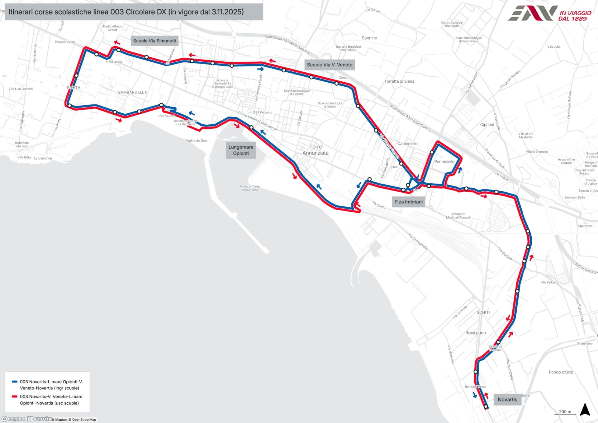 Il percorso mattutino partirà dal capolinea Novartis, proseguendo per Lungomare Oplonti, via Gino Alfani, via Prota, via Simonetti, via Vittorio Veneto, Torre Centrale e via Plinio, fino al ritorno a Rovigliano.