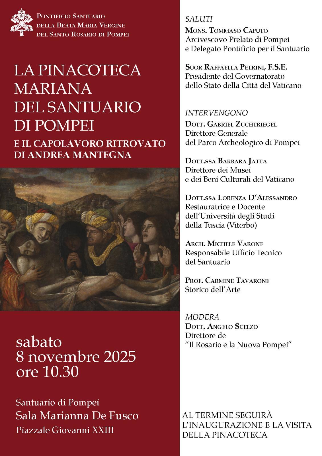 Dopo l’esposizione ai Musei Vaticani, nella mostra “Il Mantegna di Pompei. Un capolavoro ritrovato”, la “Deposizione di Cristo” tornerà a essere custodita nel Santuario, divenendo il fulcro della nuova Pinacoteca mariana.