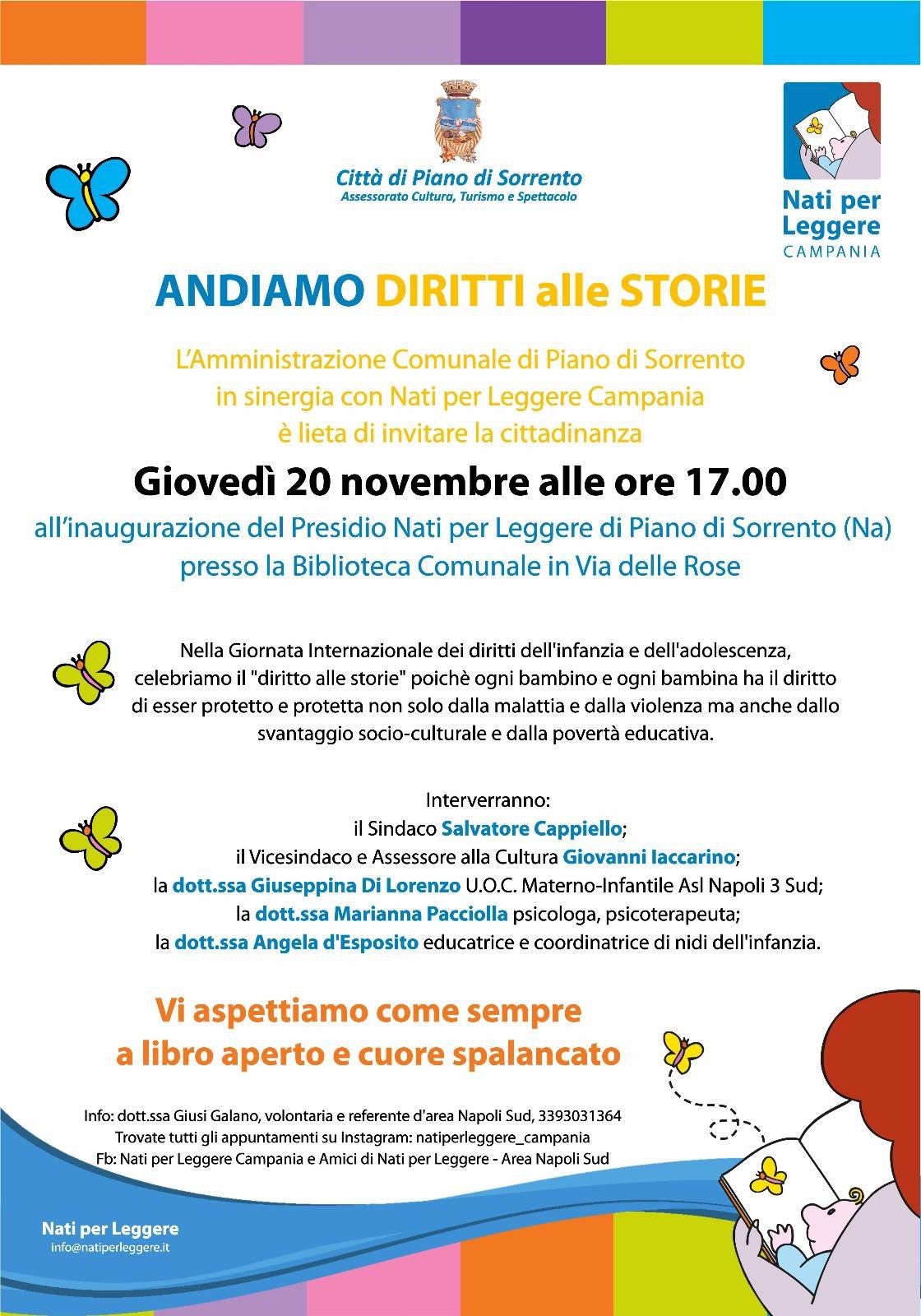 In occasione della Giornata Internazionale dei Diritti dell’Infanzia e dell’Adolescenza, l’Amministrazione Comunale di Piano di Sorrento, in sinergia con Nati per Leggere Campania, invita tutta la cittadinanza a partecipare all’inaugurazione del Presidio Nati per Leggere di Piano di Sorrento. L’evento si terrà giovedì 20 novembre alle ore 17.00 presso la Biblioteca Comunale (Via delle Rose).