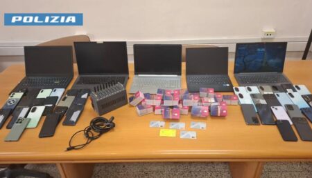 Inoltre, nel corso del medesimo servizio, i poliziotti hanno controllato l’abitazione di un 56enne napoletano dove hanno rinvenuto 5 computer portatili, un modem, 41 smartphone, 1.116 sim di diversi gestori telefonici e 5 carte di debito/credito, intestate a vari soggetti di cui non ha saputo fornire giustificazioni in merito al possesso. L’uomo è stato denunciato per ricettazione.