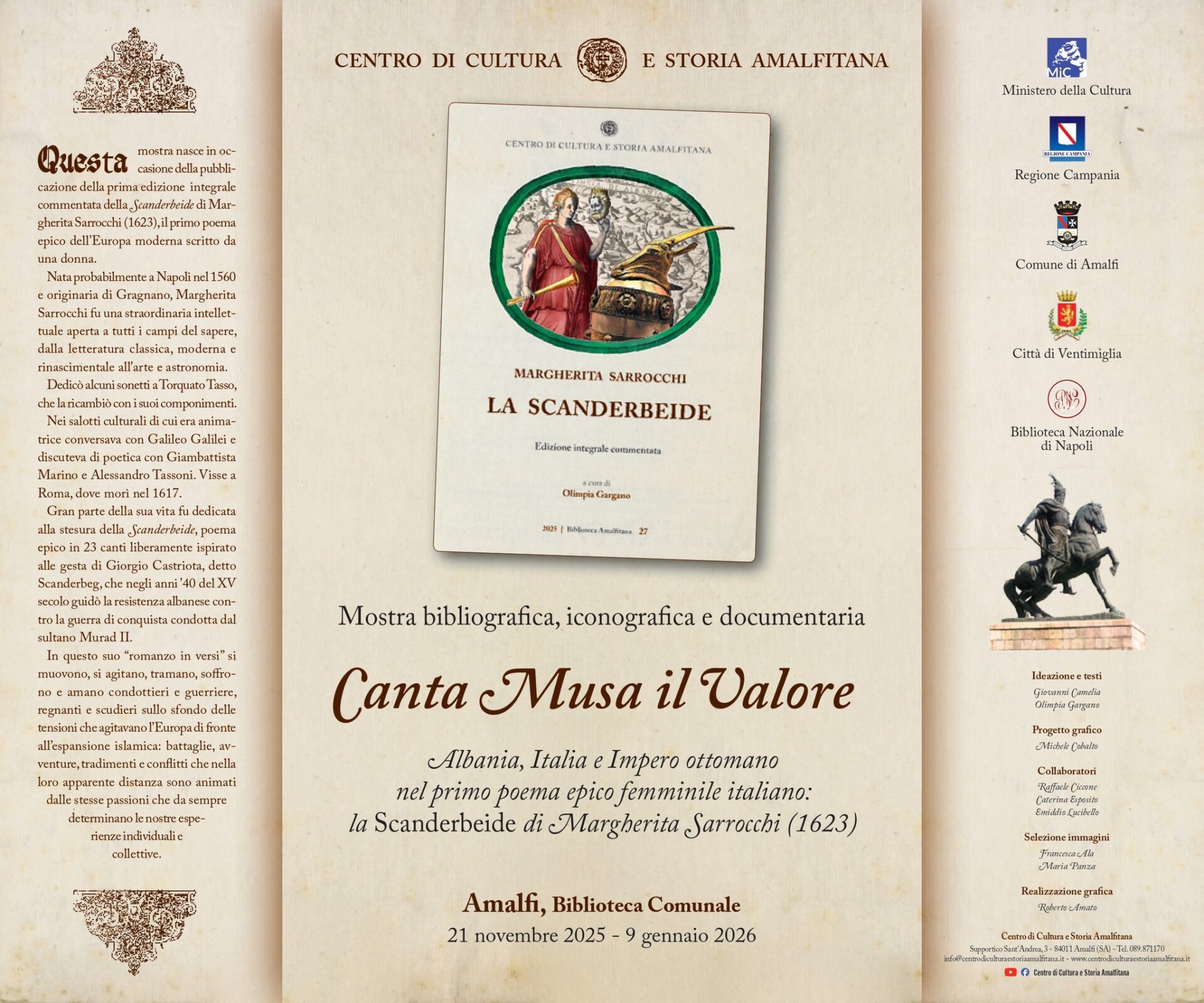 A coronamento dell’evento, dal 21 novembre 2025 al 9 gennaio 2026, la Biblioteca Comunale di Amalfi ospiterà la mostra Canta Musa il Valore. Albania, Italia e Impero Ottomano nel primo poema epico femminile italiano, con l’esposizione delle due rarissime edizioni originali del 1623, provenienti dalla Biblioteca Aprosiana di Ventimiglia e dalla Biblioteca Nazionale di Napoli.