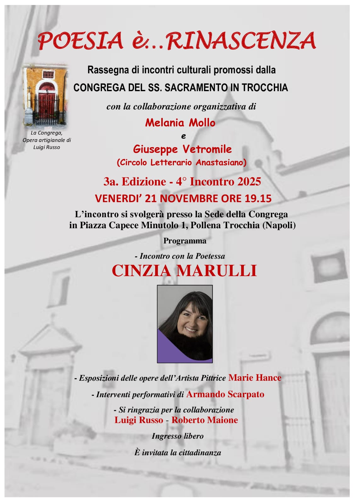 Dopo il successo dell’appuntamento inaugurale con la poetessa giapponese Mari Kashiwagi, la rassegna culturale “Poesia è… Rinascenza” torna nella suggestiva Congrega del Santissimo Sacramento nel borgo storico di Trocchia.