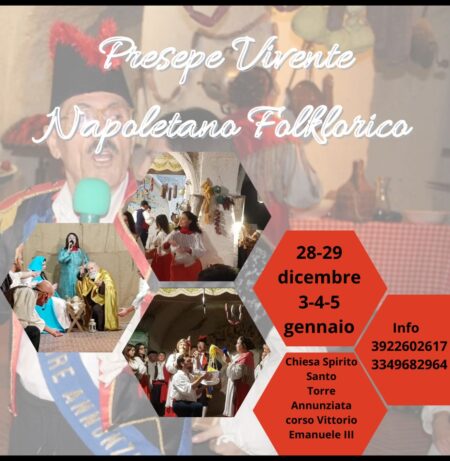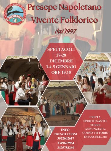 Ecco, tutto questo lo potrete rivivere il 28 e 29 dicembre ed il 3, 4 e 5 gennaio nella cripta della Parrocchia dello Spirito Santo dove il gruppo folclorico ‘O Pazziariello, tra musiche, frizzi e lazzi vi farà viaggiare nel tempo e nei ricordi. In scena va il Presepe Vivente Napoletano Folklorico, riproposizione di una giornata sul Presepe dell’800 attraverso canti, balli e brani recitati. Il “Pazzariello”, tipico banditore, accompagna lo spettatore in un viaggio tra gli antichi mestieri scomparsi.