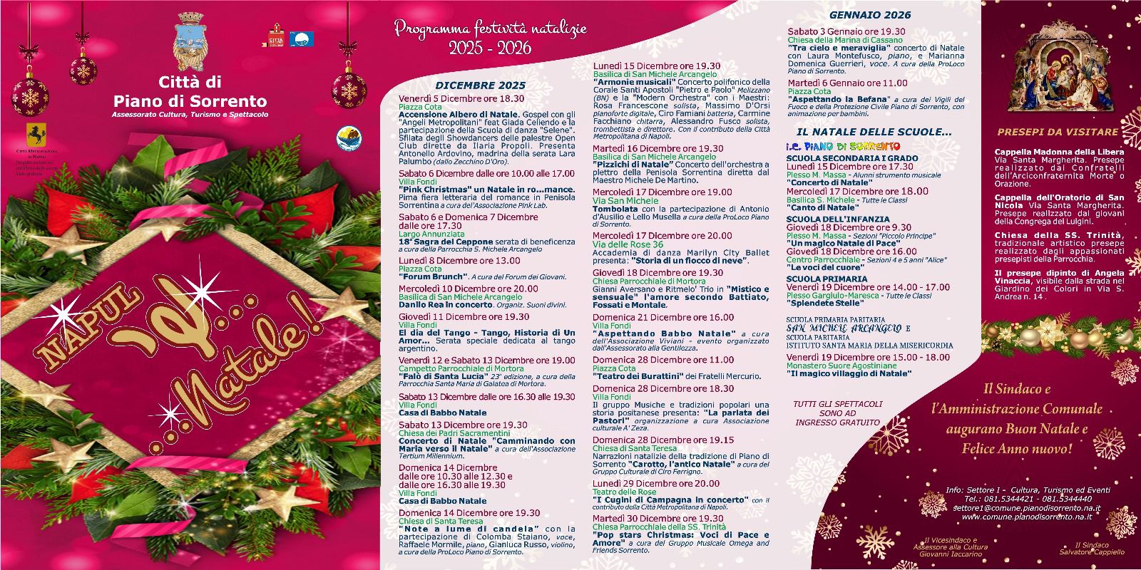 Un calendario ricchissimo, diffuso e pensato per tutte le età: è quello messo in campo dal Comune di Piano di Sorrento per le festività natalizie 2024/2025, nell’ambito della rassegna “Napul’ è Natale”. Il primo appuntamento è fissato per venerdì 5 dicembre, con l’accensione dell’Albero di Natale e delle luminarie in Piazza Cota, alle 18.30, accompagnata dall’esibizione del coro gospel “Angeli Metropolitani” feat Giada Caliendo, dalla Scuola di danza “Selene” e dagli Showdancers delle palestre Open Club. A condurre la serata sarà Antonello Ardovino, con la piccola Lara Palumbo, protagonista allo Zecchino d’Oro 2025, nel ruolo di madrina.