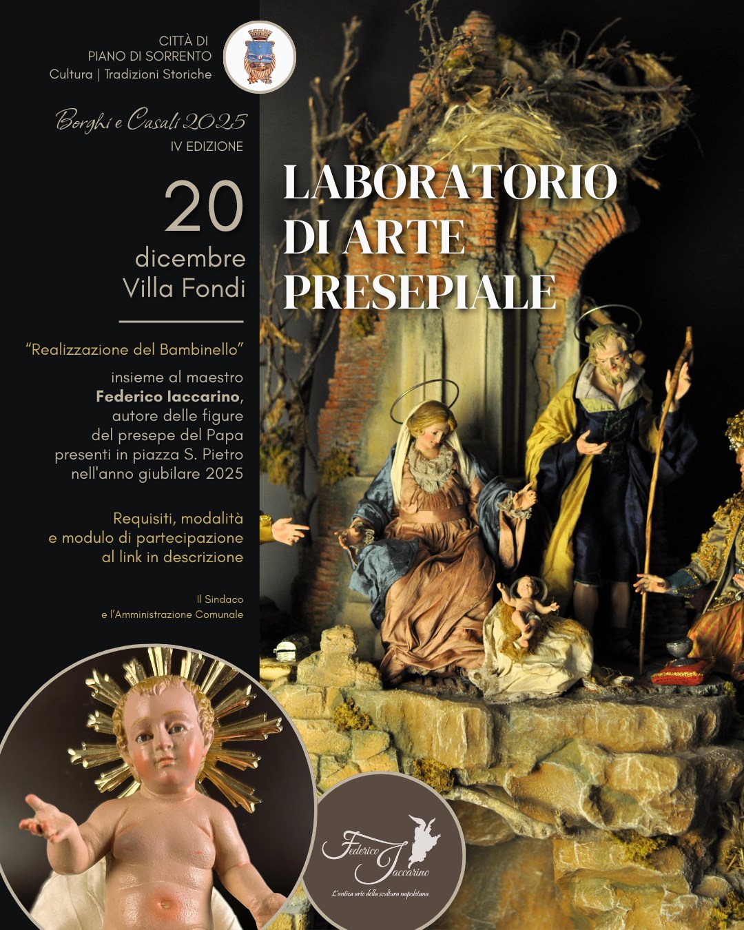 Nell’ambito del progetto “Borghi e Casali 2025 – Edizione dedicata all’Arte Presepiale”, il Comune di Piano di Sorrento promuove un laboratorio speciale dal titolo “La realizzazione del Bambinello”, che si terrà il 20 dicembre a Villa Fondi. A guidare l’iniziativa sarà Federico Iaccarino, maestro artigiano noto per aver realizzato i pastori accolti quest’anno nel presepe di Piazza San Pietro.