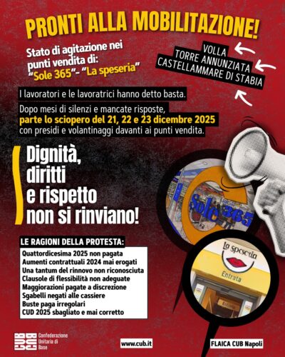 La Flaica-Cub proclama lo stato di agitazione nei punti vendita Sole365 di Volla e Torre Annunziata e La Speseria di Castellammare di Stabia dopo settimane di solleciti rimasti senza risposta e una lunga serie di criticità irrisolte che, secondo il sindacato, ledono in modo grave i diritti dei dipendenti. La decisione arriva al termine dell’assemblea dei lavoratori del 24 novembre 2025, che ha approvato un’azione di sciopero in tre giornate fissate per il 21, 22 e 23 dicembre 2025, con presidi e manifestazioni davanti ai punti vendita coinvolti.