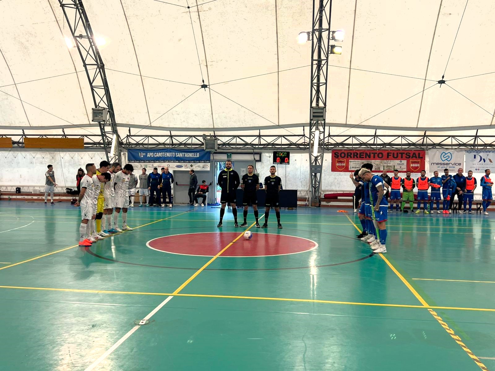 Alla tendostruttura di Sant’Agnello, complice il campo ridotto, il ritmo è altissimo e le occasioni fioccano. Il Sorrento si affida soprattutto a Fred, protagonista di un serrato duello con Massaro, ancora una volta titolare. È proprio Fred ad accorciare all’11’, ribadendo in rete una respinta del portiere biancoblù.