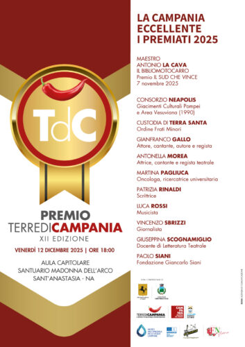 Dieci i protagonisti della XII edizione del Premio Terre di Campania, che si svolgerà venerdì 12 dicembre alle 18, nell’Aula Capitolare del Santuario della Madonna dell’Arco. In un anno in cui si è parlato e ancora si parla di Pace, senza purtroppo vederla realizzata, l’Associazione Terre di Campania APS, fondatrice del Premio, dedica quest’ultimo a chi, col suo impegno quotidiano, diventa testimone concreto di Pace nella quotidianità.