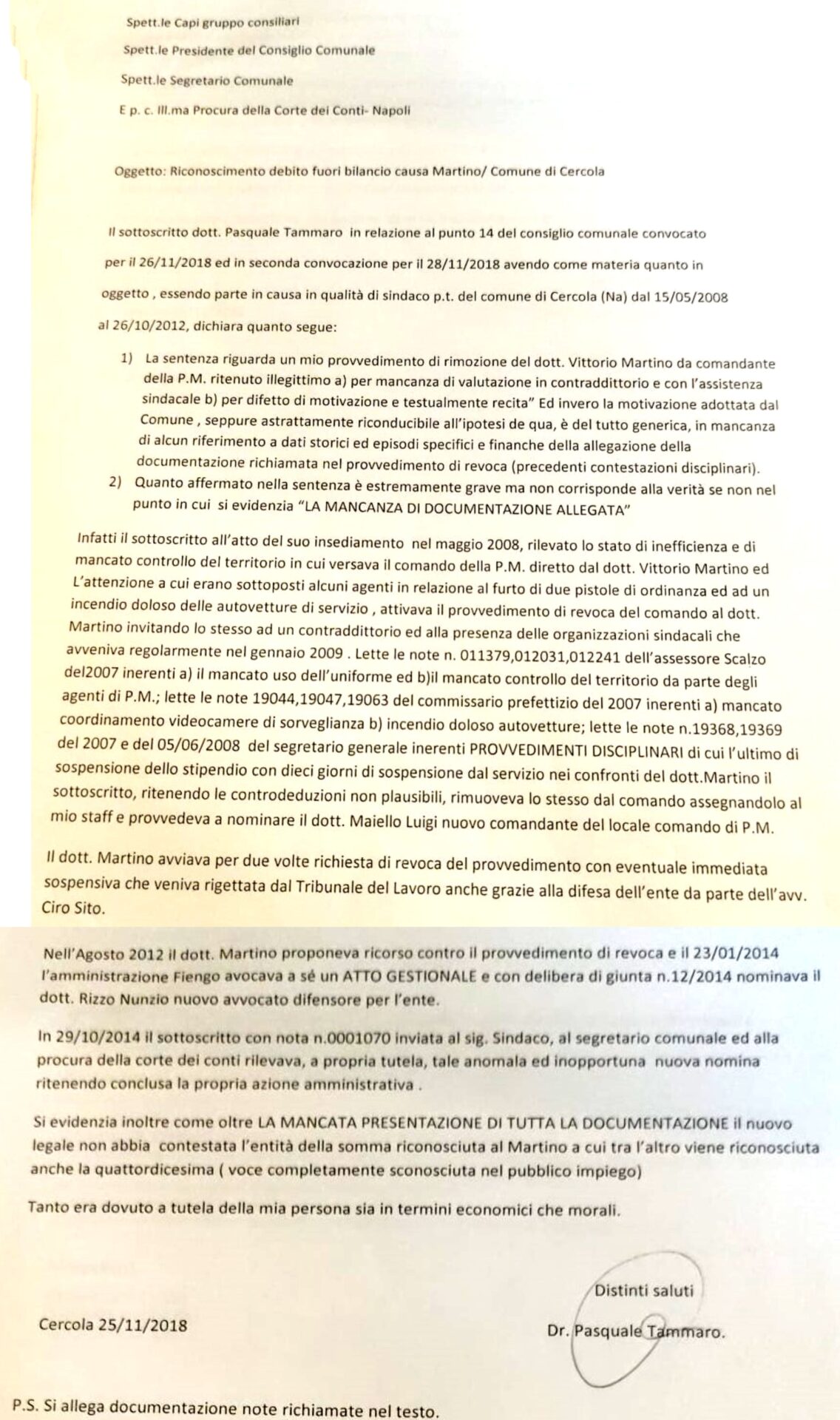 “Il sottoscritto dr. Pasquale Tammaro, nato a Cercola il 06/09/1949, sindaco p.t. del comune di Cercola dal 15/05/2008 al 24/10/2012,