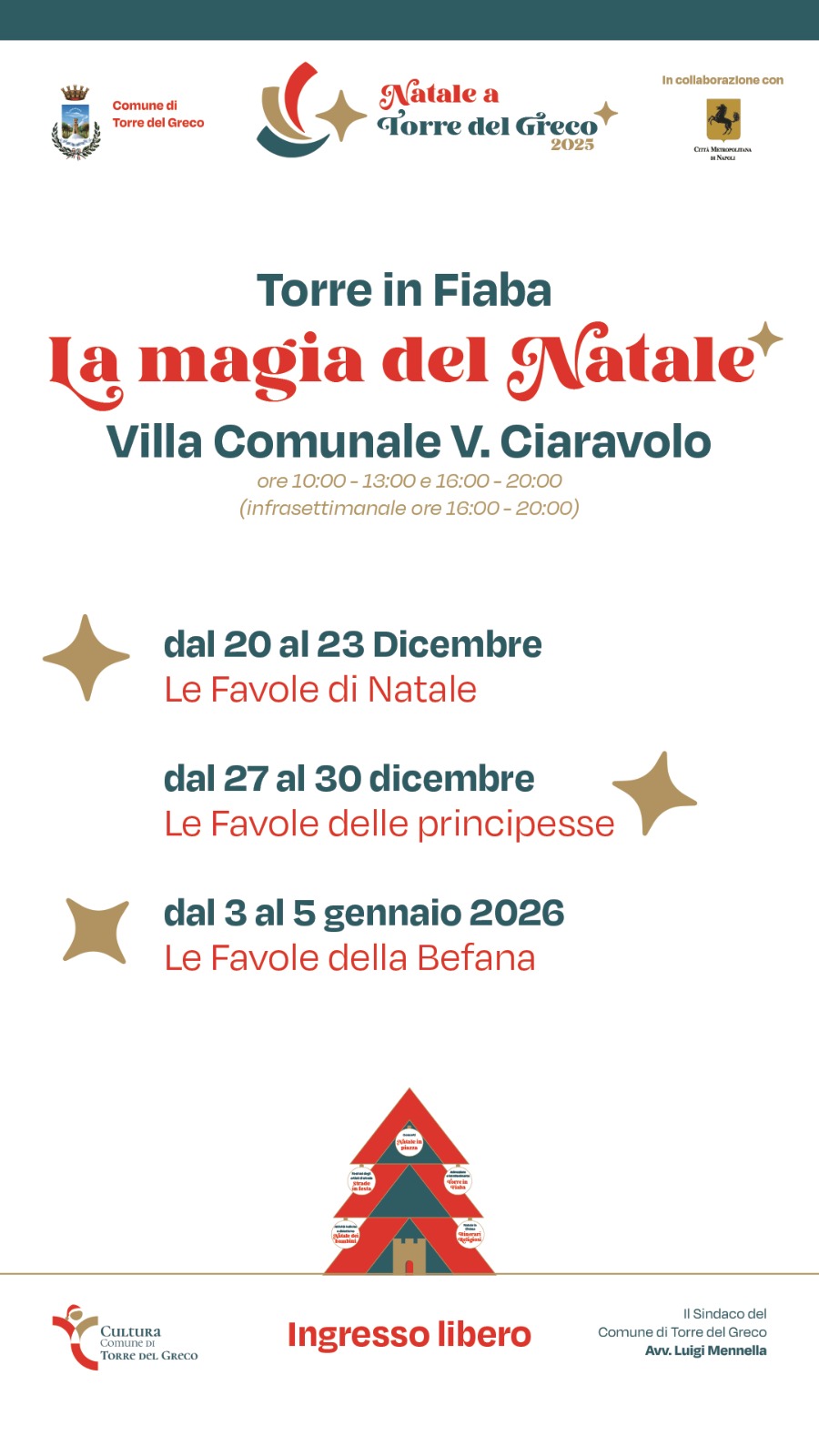 Anticipa invece il calendario la rassegna “Torre in fiaba – La magia del Natale”, che prenderà il via sabato 19 dicembre nella villa comunale Ciaravolo, su corso Vittorio Emanuele. Fino a martedì 23 dicembre, i primi appuntamenti, intitolati “Le favole del Natale”, animeranno il polmone verde cittadino con racconti, personaggi e spettacoli pensati per incantare i più piccoli e accompagnarli nel clima più autentico delle feste.
