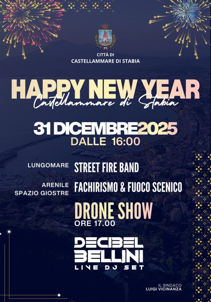 Un suggestivo spettacolo di droni tra cielo e mare sarà il momento simbolo dell’evento diffuso con cui Castellammare di Stabia accompagnerà cittadini e visitatori verso il 2026. Dalle ore 16.00 di mercoledì 31 dicembre, il lungomare stabiese diventerà il cuore pulsante di un pomeriggio di festa tra musica, giochi di fuoco e il live dj set di Decibel Bellini.
