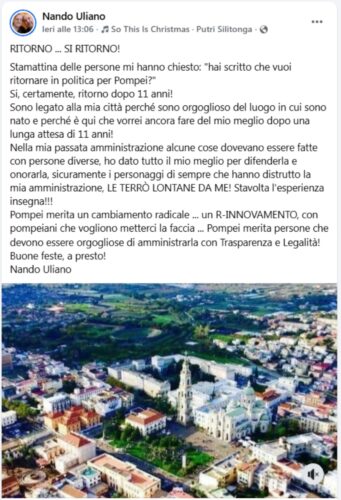 Ferdinando “Nando” Uliano, già sindaco di Pompei tra il 2014 e il 2016, ha annunciato la sua intenzione di candidarsi nuovamente alle prossime elezioni comunali. L’annuncio, riportato sui social, dove l’ex sindaco scrive “Ritorno… Si Ritorno!”, arriva in un momento in cui la scena politica pompeiana prende forma in vista delle amministrative che si terranno la prossima primavera.
