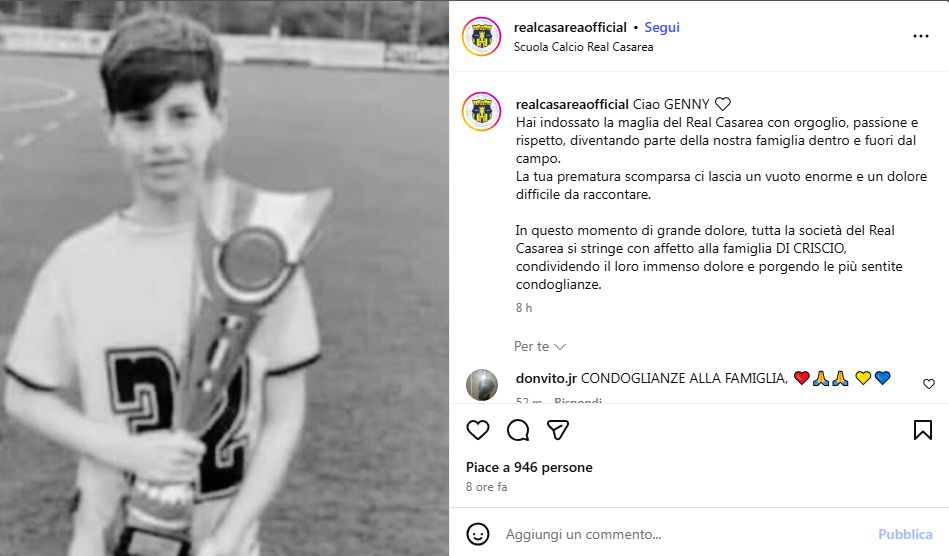 Conosciuto da tutti come Genny, Di Criscio era un appassionato di calcio ed era cresciuto nelle giovanili del Real Casarea. La società lo ha ricordato con un messaggio affidato ai social: «Hai indossato la maglia del Real Casarea con orgoglio, passione e rispetto, diventando parte della nostra famiglia dentro e fuori dal campo. La tua prematura scomparsa ci lascia un vuoto enorme e un dolore difficile da raccontare».