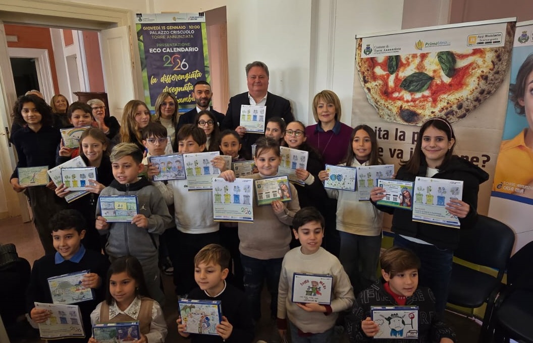 È stato presentato questa mattina, nella sala di Palazzo Criscuolo, l’Eco-Calendario 2026 di Torre Annunziata. L’iniziativa, giunta alla seconda edizione, è stata promossa dall’Amministrazione Comunale in collaborazione con Prima Vera e ha coinvolto i quattro istituti comprensivi cittadini con l’obiettivo di educare i più giovani alla corretta raccolta differenziata.
