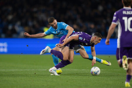 Al 25’ la partita cambia volto. La Fiorentina, fino a quel momento imbambolata, si scuote. Su punizione di Fagioli, Piccoli svetta e colpisce una clamorosa traversa. L’azione prosegue e Gudmundsson, ancora di testa, costringe Meret a un intervento prodigioso. È una doppia fiammata che riporta in partita i viola e accende il Maradona.