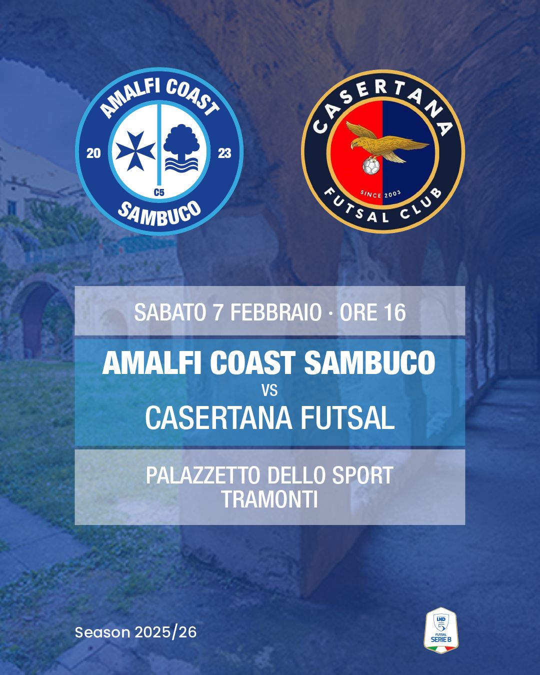 Sarà un sabato di grande futsal quello in programma al Palazzetto dello Sport di Tramonti, dove l’Amalfi Coast Sambuco ospiterà la Casertana Futsal per la 16ª giornata del Girone F di Serie B. Fischio di inizio fissato per sabato 7 febbraio alle ore 16.