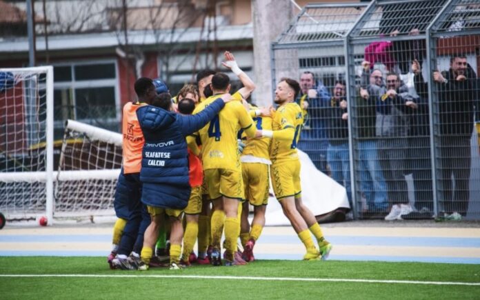 91’ Scafatese in vantaggio: Palmieri tira due volte, alla seconda la palla arriva a Molinaro che la controlla e segna. 0-1.
