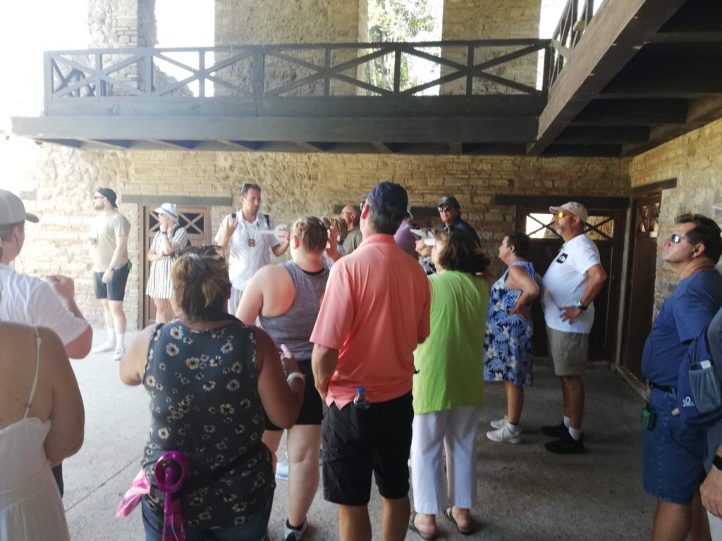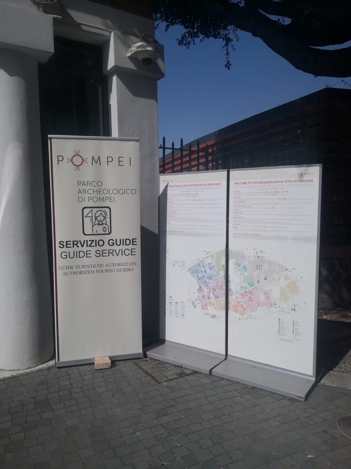 La postazione delle guide fu istituita nel 2010, durante il commissariamento del sito archeologico, con l’obiettivo di riorganizzare il servizio di visite guidate agli ingressi e migliorare la fruibilità del sito, offrendo ai visitatori la possibilità di partecipare a visite nella propria lingua. Con il tempo si è trasformata in un vero e proprio servizio all’utenza e in una opportunità lavorativa stabile, frutto di uno scambio durato quindici anni.