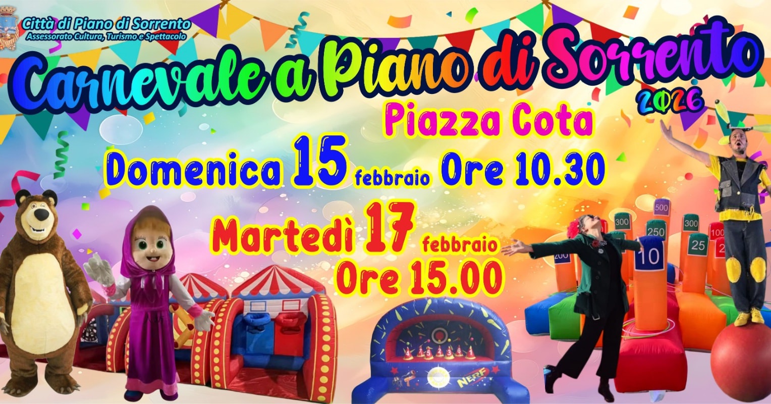 La città di Piano di Sorrento si prepara a celebrare uno degli appuntamenti più attesi dell’anno con il Carnevale 2026, in programma domenica 15 e martedì 17 febbraio nella centralissima Piazza Cota.
