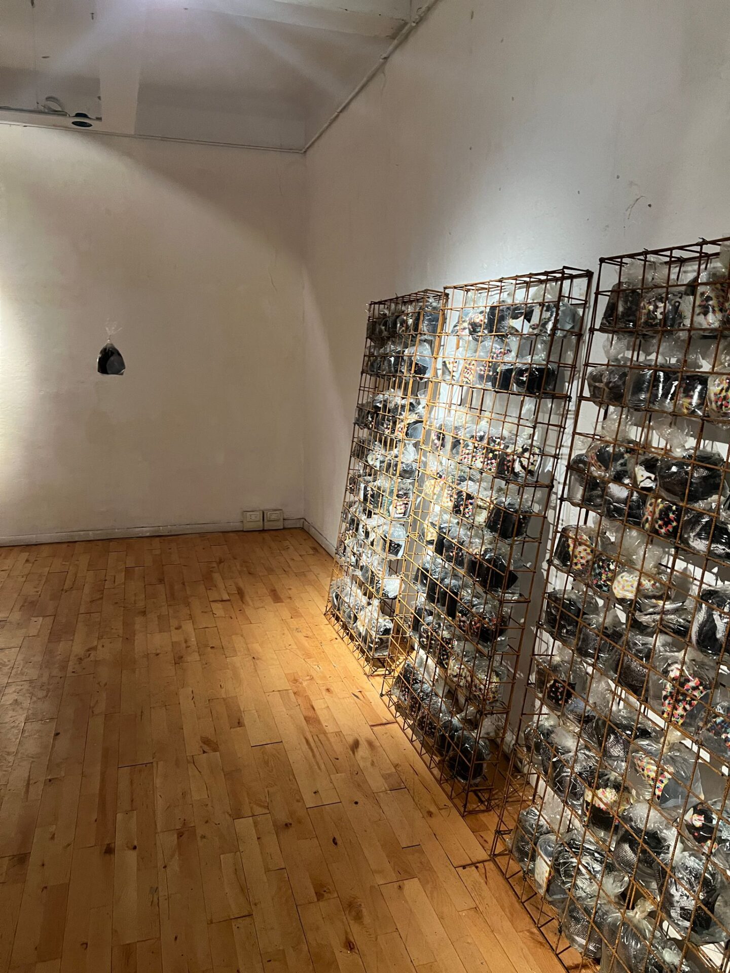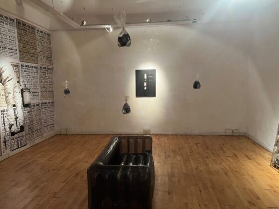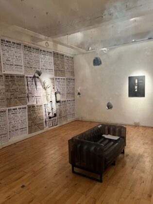 Accanto alle affissioni, Petrucci propone un’installazione intima e fragile: una costellazione minimale di carte, parole, immagini e pensieri sospesi in un liquido puro. Ogni frammento appare come una reliquia contemporanea, testimonianza autentica del “qui e ora”.