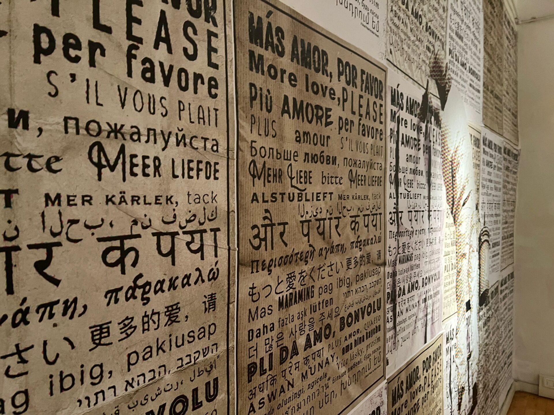 Il percorso espositivo si apre con una parata di manifesti affissi “fuori e dentro la porta”, su cui campeggia, in 26 lingue diverse, la scritta: “Più amore, per favore”.