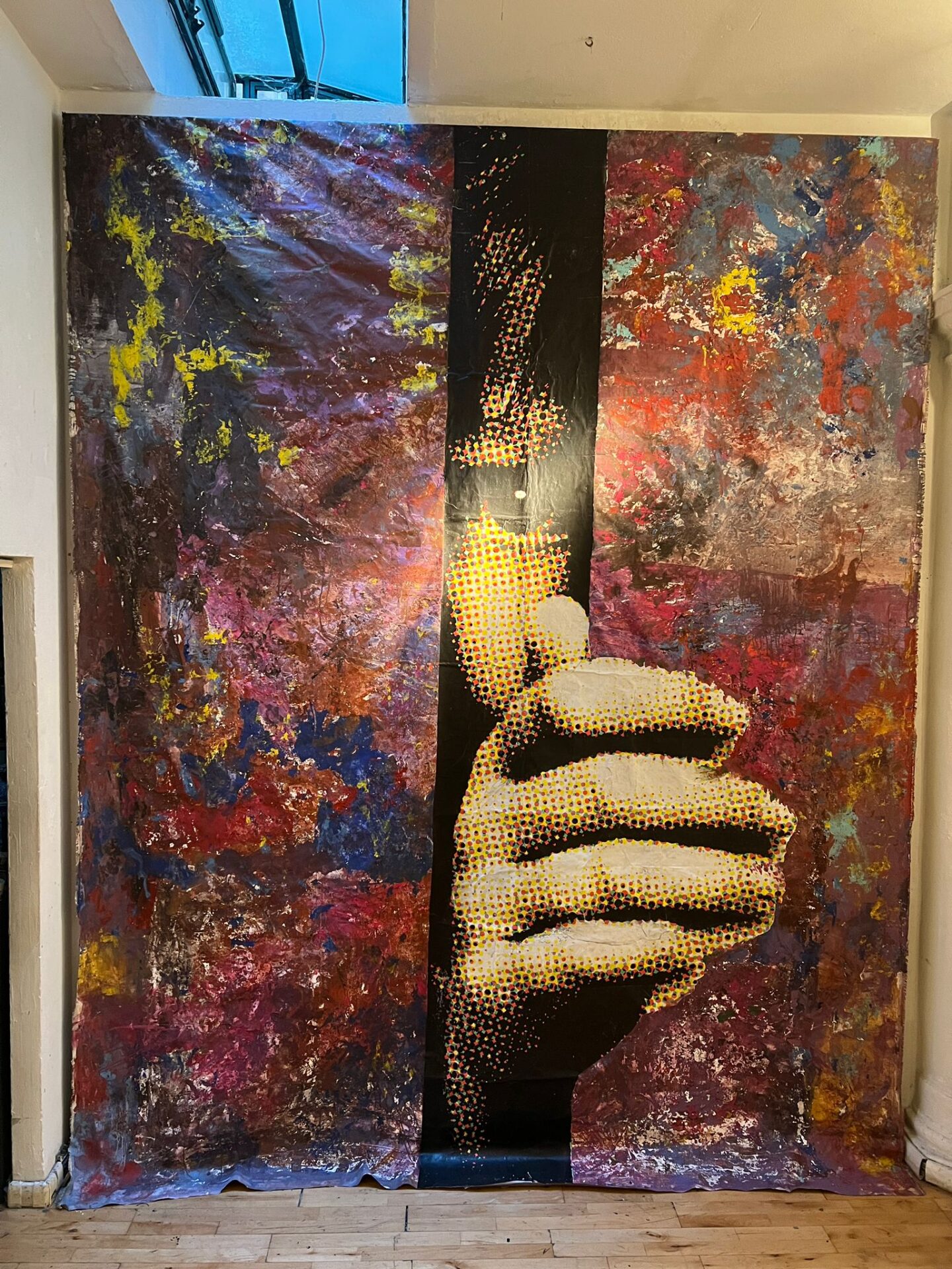 Ai lati, un’esplosione di espressionismo astratto – rossi, blu, gialli – evoca il “rumore” del mondo contemporaneo: tensioni, perdita di senso, fratture sociali. Al centro, invece, l’atto dello schiudere diventa simbolico. Non è solo un gesto: è una forza che trattiene la porta aperta, che invita a non chiudersi.