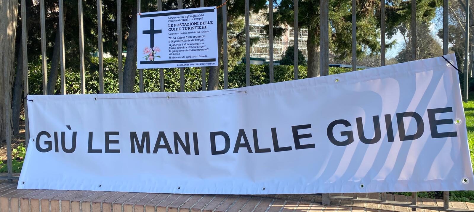Tra manifesti funebri riportanti scritte ironiche e striscioni con le scritte “Giù le mani dalle guide”, la tensione è salita, aggravato dalla notizia di una lettera di minacce indirizzata al direttore Gabriel Zuchtriegel e alla sua famiglia.