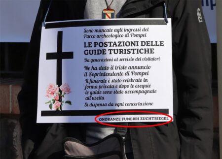 Tra manifesti funebri riportanti scritte ironiche e striscioni con le scritte “Giù le mani dalle guide”, la tensione è salita, aggravato dalla notizia di una lettera di minacce indirizzata al direttore Gabriel Zuchtriegel e alla sua famiglia.