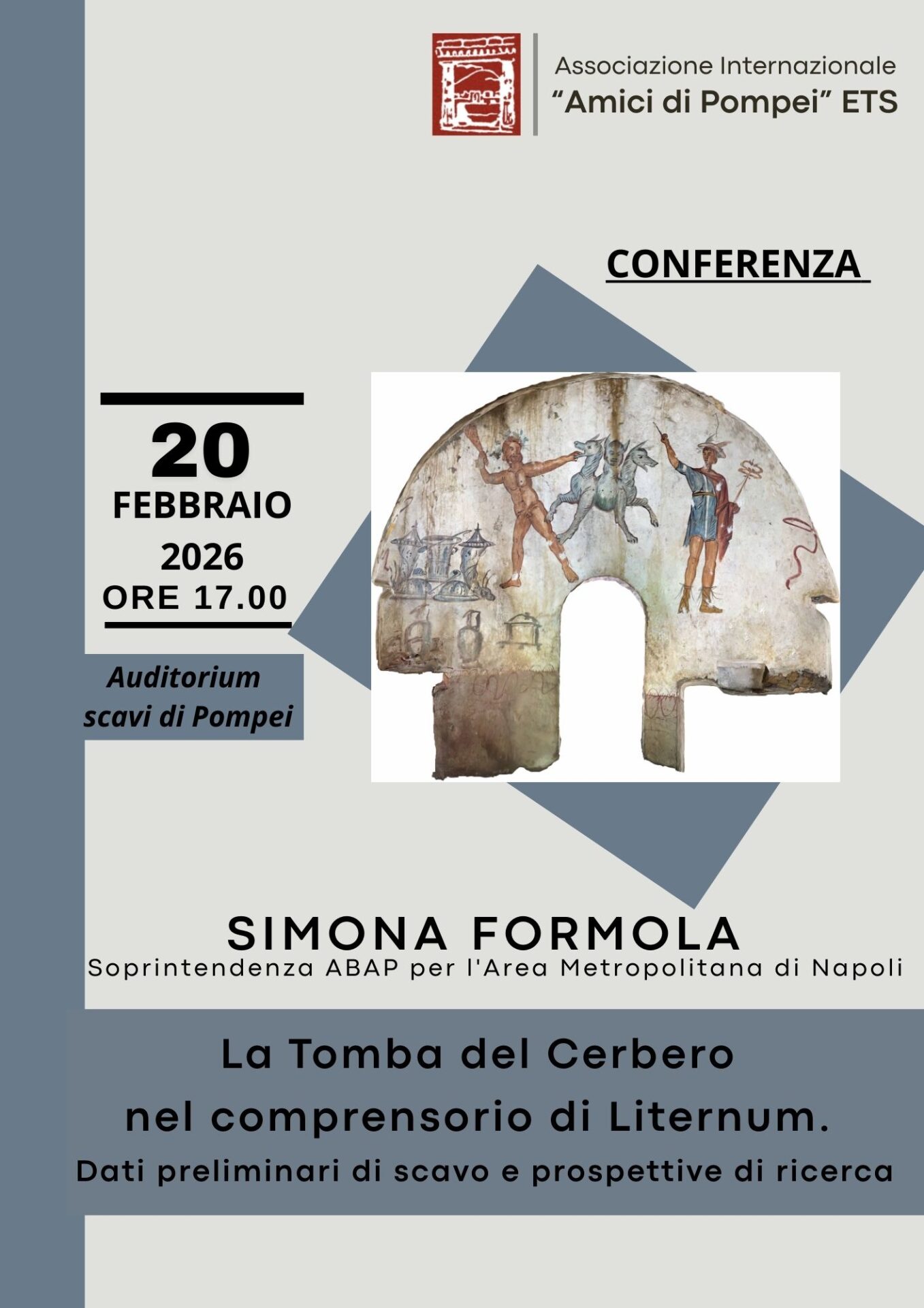 Venerdì 20 febbraio, alle ore 17, presso l’Auditorium degli Scavi di Pompei, l’Associazione Internazionale Amici di Pompei ETS propone la conferenza dell’archeologa Simona Formola, Funzionario della Soprintendenza ABAP per l’area metropolitana di Napoli, dal titolo: “La Tomba del Cerbero nel comprensorio di Liternum. Dati preliminari di scavo e prospettive di ricerca”.