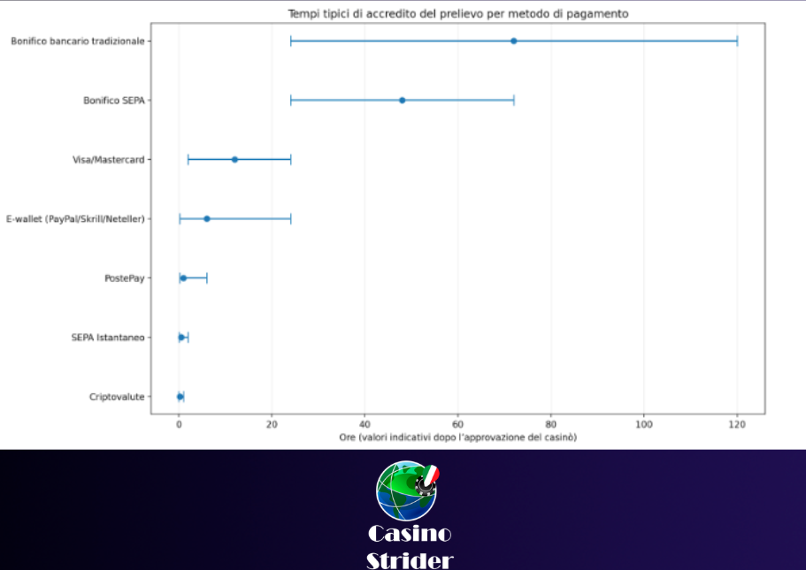 Per vedere la differenza a colpo d’occhio, ecco un confronto dei tempi tipici di accredito (dopo l’approvazione del casinò) per ciascun metodo.
