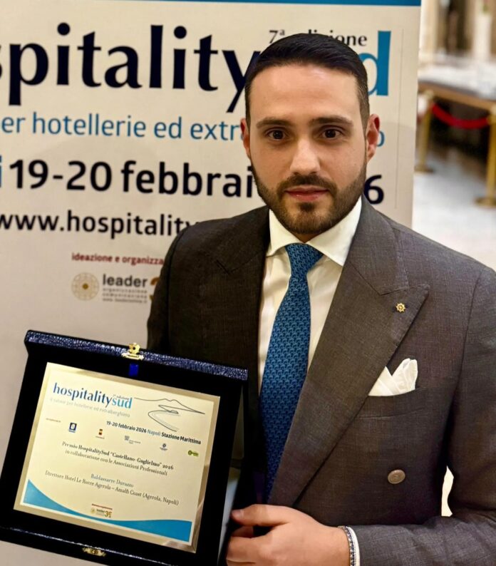 Un giovane pimontese tra le eccellenze dell’hotellerie italiana. Ci sono riconoscimenti che vanno oltre il successo personale e diventano motivo di orgoglio per un’intera comunità. È il caso di Baldo Durazzo, 34enne professionista di Pimonte, premiato a livello nazionale come “Direttore d’Albergo Under 35 – anno 2026”, nell’ambito del prestigioso premio “Castellano–Guglielmo”. Il riconoscimento è stato conferito nel corso di Hospitality Sud, il principale salone dedicato all’hotellerie e all’extralberghiero del Centro-Sud Italia, svoltosi presso la Stazione Marittima di Napoli. Tra i presenti all’evento l’assessore al Turismo della Regione Campania, Vincenzo Maraio, e l’assessore al Turismo del Comune di Napoli, Teresa Armato.