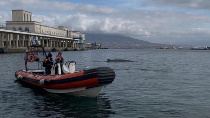 Per guidare la balenottera verso il largo in sicurezza e verificare che non riporti ferite, si attendono gli specialisti della Stazione Zoologica Anton Dohrn.