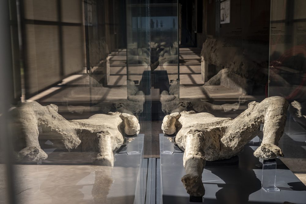 Il successo di questa mostra non sta solo negli oggetti esposti, ma nella capacità di trasformare il sito in un museo vivo. Donne accovacciate, bambini in braccio ai genitori e uomini distesi, con le braccia aperte o con le mani in faccia, sono riprodotti attraverso la tecnica dei calchi nel “memoriale” che racconta la fine di Pompei e mostra le sue vittime nell’istante esatto in cui vennero ricoperte da cenere e lapilli nel 79 dopo Cristo. È il modo per guardare in faccia quella tragedia e percepire il dolore e la paura, il tentativo inutile di proteggersi. I 22 corpi in gesso, per la prima volta, compongono l’allestimento permanente nella Palestra Grande degli scavi, insieme ai cibi dell’epoca, e il percorso è stato inaugurato oggi dal Direttore e dal Ministro della Cultura Alessandro Giuli.