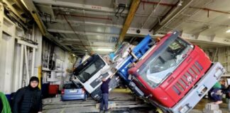 Ischia, onda anomala fa rovesciare due camion all’interno di una nave. Due auto distrutte