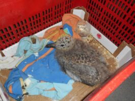 Pullus di gabbiano davanti alla chiesa di San Michele a Piano di Sorrento