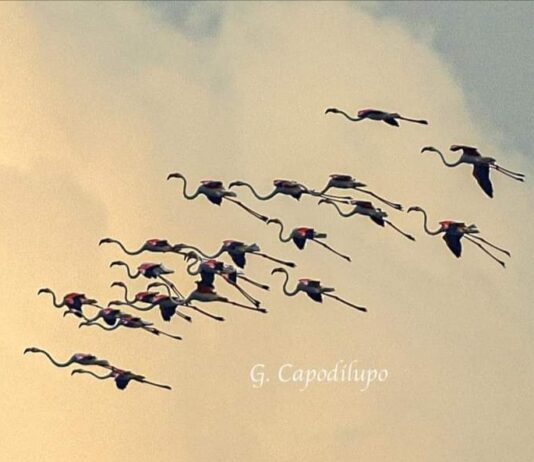 Stormo di fenicotteri rosa attraversa l’Amp Punta Campanella